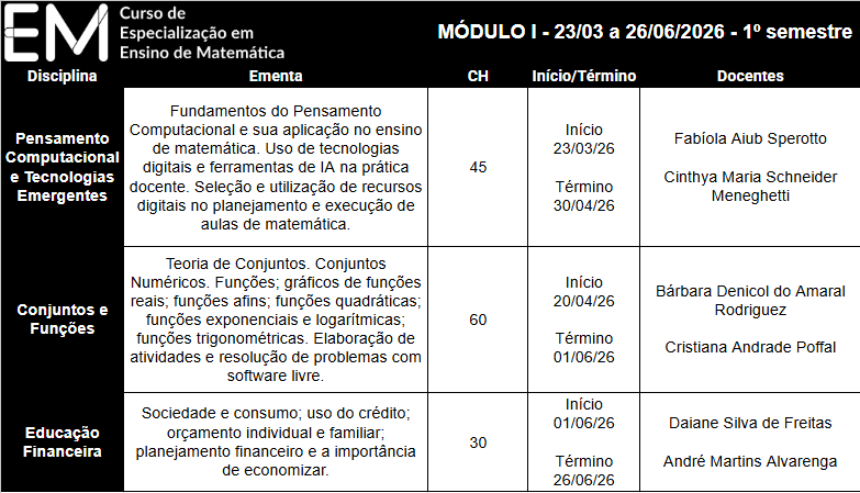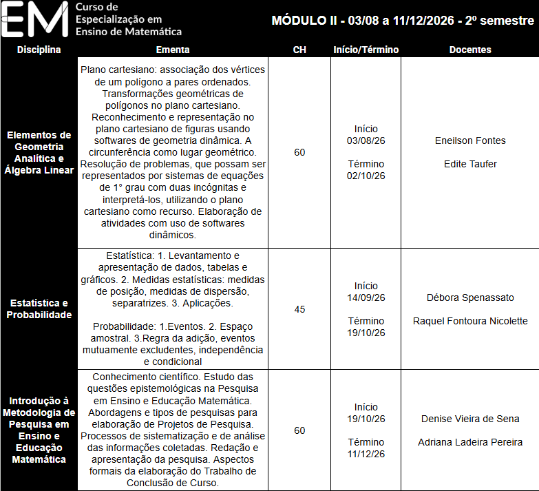 - Introdução à Metodologia de Pesquisa em Ensino e Educação Matemática (60 h/a) - Profs. Denise Sena e Tiago Dziekaniak;