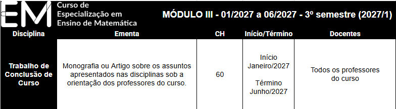 O curso, em observância a Resolução CNE/CES No 1, 06/04/2018, terá uma carga horária total de 360 (trezentos e sessenta) horas, distribuídas em três módulos, à distância, buscando estudar, discutir e analisar os conhecimentos teórico-práticos que envolvem o ensino de Matemática em consonância com as unidades temáticas propostas pela BNCC. O primeiro e segundo módulo serão dedicados às disciplinas de formação, ofertados, respectivamente, no 1º semestre letivo de 2026 e no 2º semestre letivo de 2026, e o terceiro módulo ao trabalho de Conclusão de Curso, a ser ofertado no 1° semestre letivo de 2027.